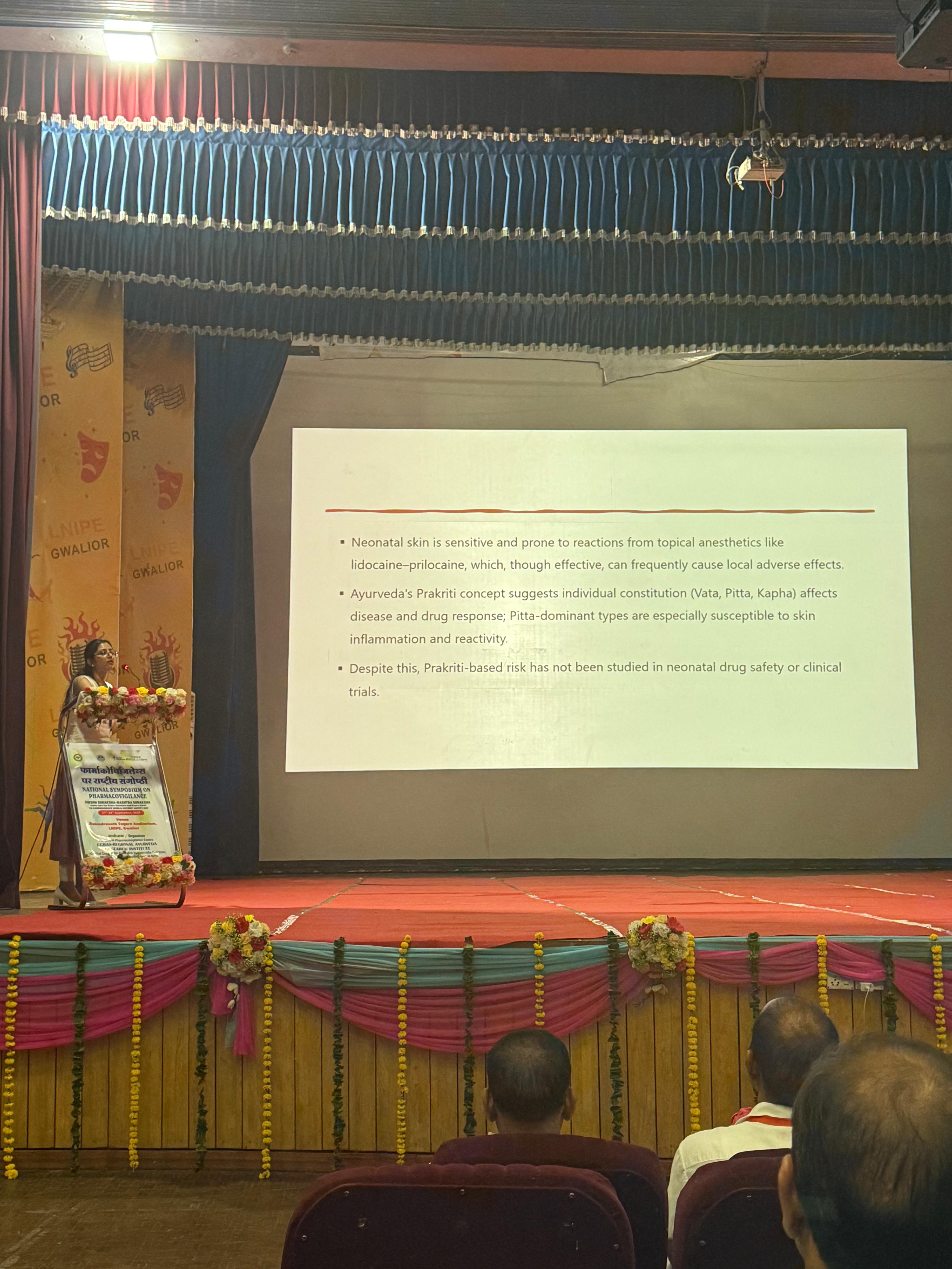 Dr. Chhavi Rosha presented a paper titled 'Pitta Prakriti as a Predictor of Local Cutaneous Reactions in Neonates: A Post-Hoc Subgroup Analysis from a Randomized Control Trial of a Novel Ayurvedic Topical Anaesthetic and Lidocaine Prilocaine Cream During Venipuncture' at National Symposium on Pharmacovigilance, 'Shishu Suraksha-Rashtra Suraksha' (Safe Care for Every Newborn and Every Child). The symposium was conducted at Gwalior and jointly organized by CCRAS, RARI Gwalior (PPvC) in collaboration with AIIA New Delhi (NPvCC) on 17 and 18 September 2025