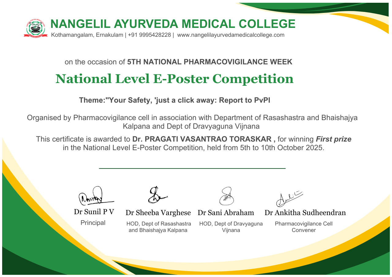 Dr. Pragati Toraskar, MD II year scholar of Department of Rasashastra evam Bhaishajyakalpana, BVDU College of Ayurved Pune, has received first prize in national level e-poster competition organized to mark the National Pharmacovigilance week 2025. The competition was organized by Department of Rasashastra and Bhaishajyakalpana, Nangelil Ayurved Medical College, Kothamangalam, Ernakulam Kerala. She received guidance from Dr. Trupti Patil Bhole for the poster titled as 'Patient awareness for drug safety: ADR/AE [AYUSH'