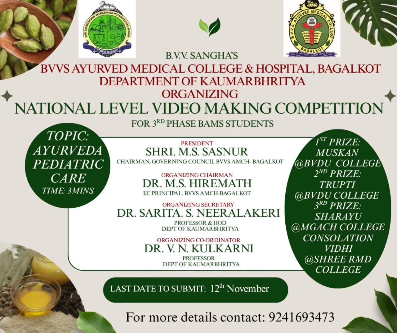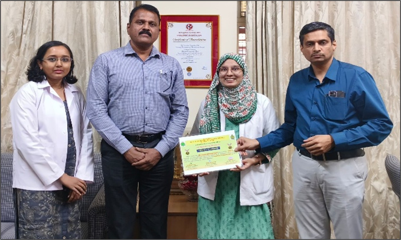 Our Final BAMS students, Miss Muskan Patil and Miss Trupti Nikam, secured First Prize and Second Prize respectively at a National Level Video Making Competition organized by BVVS Ayurveda Medical College and Hospital, Bagalkot, under the Department of Kaumarbhritya.