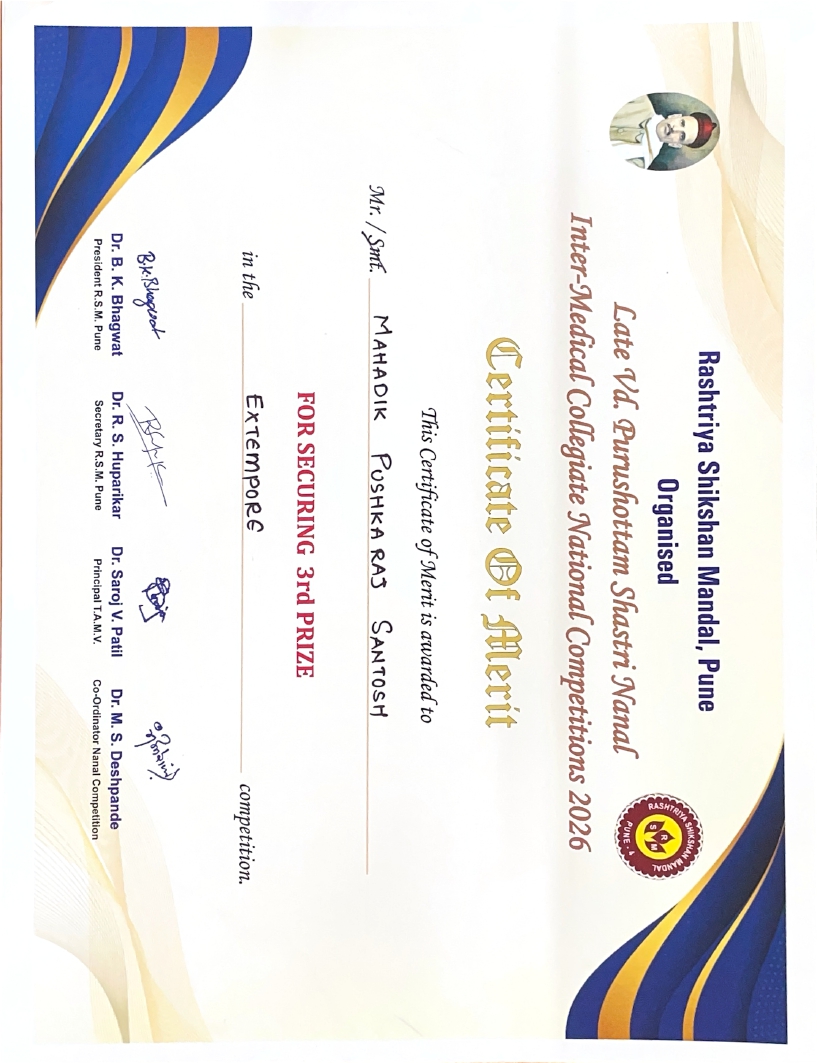 Mr. Pushkaraj Santosh Mahadik, 2nd Year BAMS student of Bharati Vidyapeeth Deemed to be University College of Ayurveda, Pune, secured 2nd Prize in Nanal Inter-Medical Competition (Group 1) at the National Level Inter-Medical College Competitions 2026, organized by Rashtriya Shikshan Mandal.