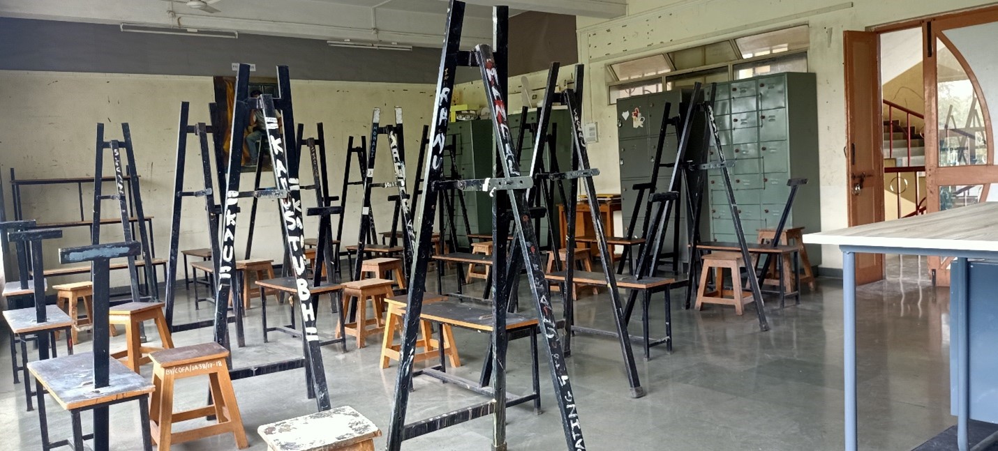 - Every class is provided with a Donkey, Easel, Model Stand, Focusing Light, Different Colors of Drapery and Locker for every Student, Garbage System and Electric Boards.